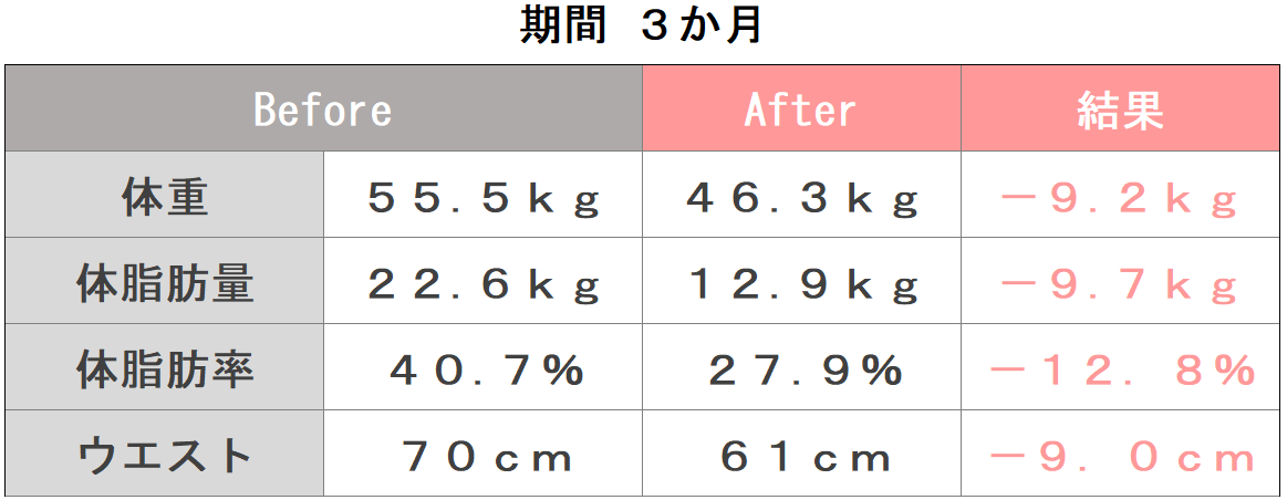しかも、体脂肪で―4キロなので悪くないと思っています。それ以上に気にしていたお腹がー10.5cmとかなりスッキリしたので嬉しいです。