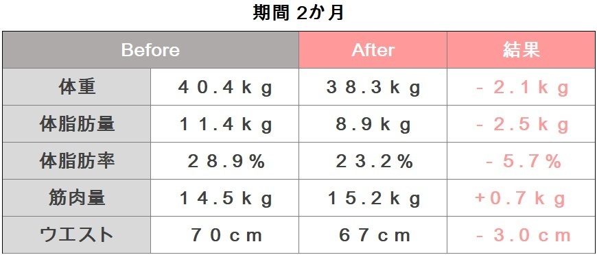 結果は2か月で体重-6.5キロ、ウエスト-6.0cm。体重以上に見た目のお腹周りと太ももがスッキリしたことが嬉しいです。
